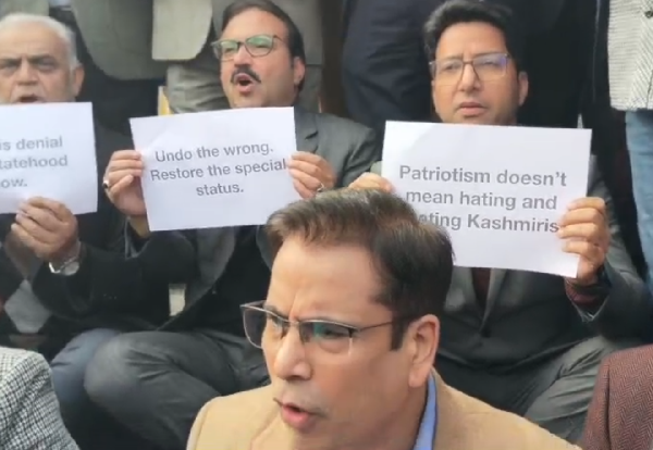 احتجاج کرن وٲلۍ قانون ساز ٲسۍ پننین اتھن منٛز بینر رٹتھ تہٕ بَڑِ نعرہ لگاوان۔