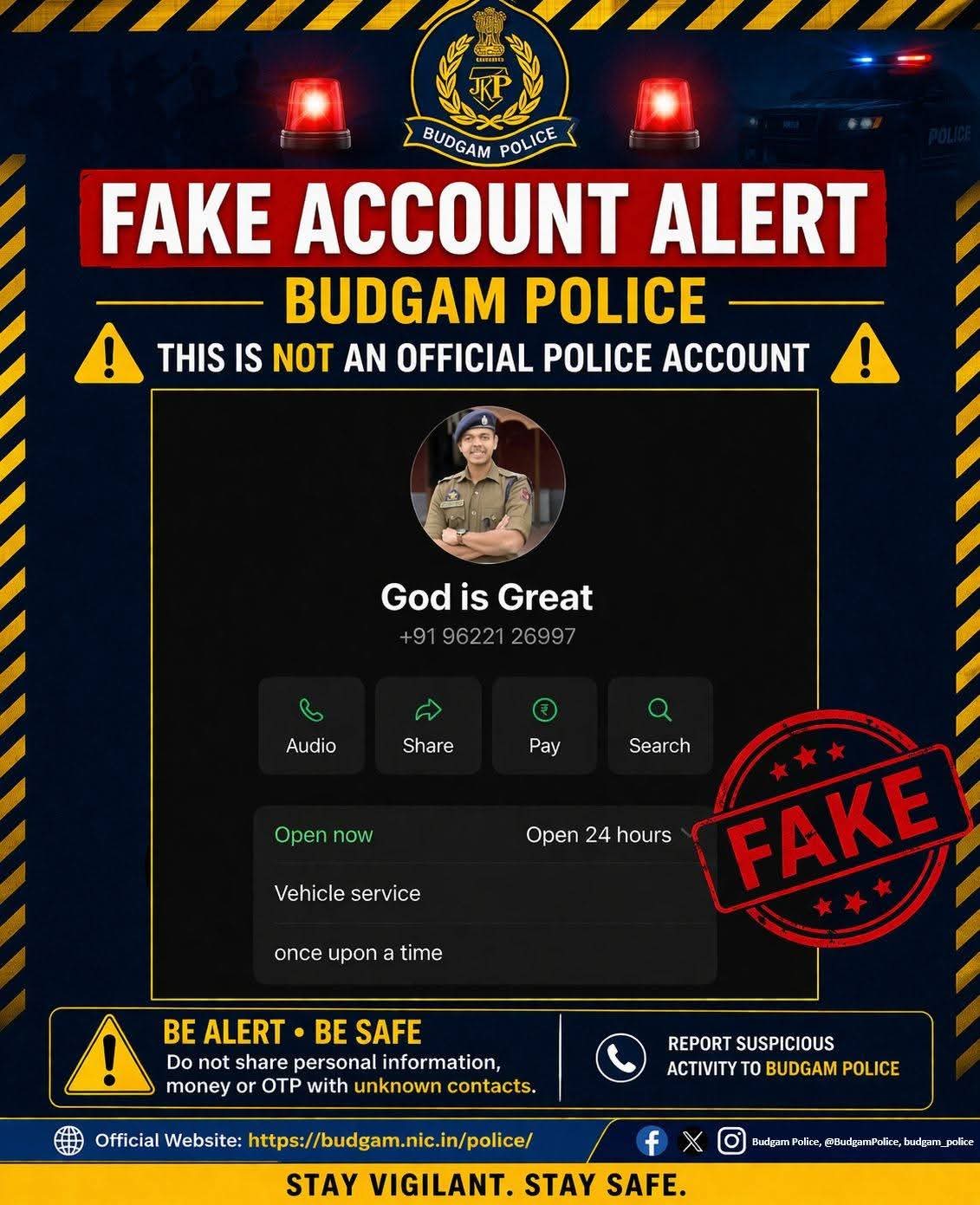 پُلیٖس تھانہٕ بڈگامَس مِلیوٚو بَھروسہٕ زانٛکٲری زِ اَکھ شخٕص، سمیر علی بھٹ س/او غلام محمد بھٹ سٕنٛدِ سٕنٛدِ پَلر بُڈگام، اوس عام لوٗکَن منٛز ایس ایس پی بڈگام سٕنٛدِس ناوَس پٮ۪ٹھ چلاونہٕ یِنہٕ وٲلِس جعلی واٹس ایپ اکاؤنٹَس سۭتۍ چیٹَن ہُنٛد سکرین شاٹ شیئر کران تہٕ لوٗکَن پٮ۪ٹھ اثر انداز کرنہٕ باپتھ اوس قریبی سٲتھی سُنٛد روپ دِوان۔تصدیٖق کرنہٕ پتہٕ آو یہِ وُچھنہٕ زِ یہِ شخٕص چھُ واریاہَن ایف آی آرَن منٛز مُلوث تہٕ اوس موبائل نمبر +91-9622126997 استعمال کٔرِتھ ایس ایس پی بڈگام کِس ناوَس پٮ۪ٹھ اکھ نقلی واٹس ایپ اکاؤنٹ چلاوان۔ سُہ اوس پنُن پان اکھ قریبی سٲتھی پٲٹھۍ پیش کرنہٕ خٲطرٕ کتھ باتھہِ ہٕنٛدۍ سکرین شاٹ تہِ شیئر کران۔